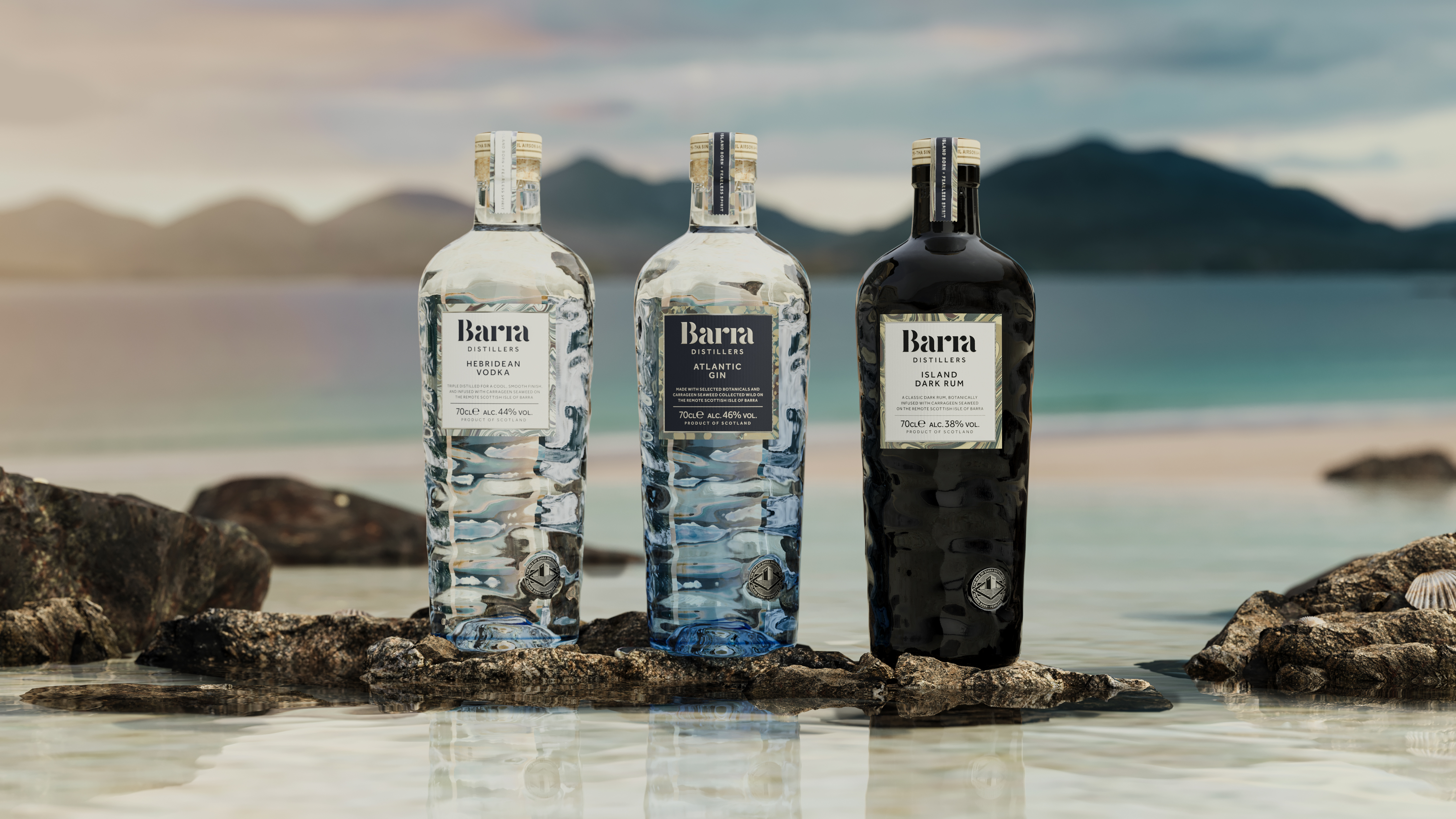The Isle of Barra Distillers Co. was founded by Michael and Katie Morrison, a husband and wife team born and bred on the island intent on bottling and sharing the essence of Barra with the world. We developed parent and product brands, including the creation of the brand story, brand guidelines, product packaging and a bespoke E-commerce website. The custom glass bottle reflects the brand home on the edge of the wild Atlantic Ocean. Made from recycled glass and 17% lighter than its predecessor, it’s plastic free, 100% recyclable and made in the UK 382 miles closer to Barra than the original. Broad shouldered to reflect the hardworking nature of the island people, we mapped images of the Atlantic Ocean waves to create the ripples in the glass, creating a bottle that looks and feels like it’s been shaped by the sea itself.